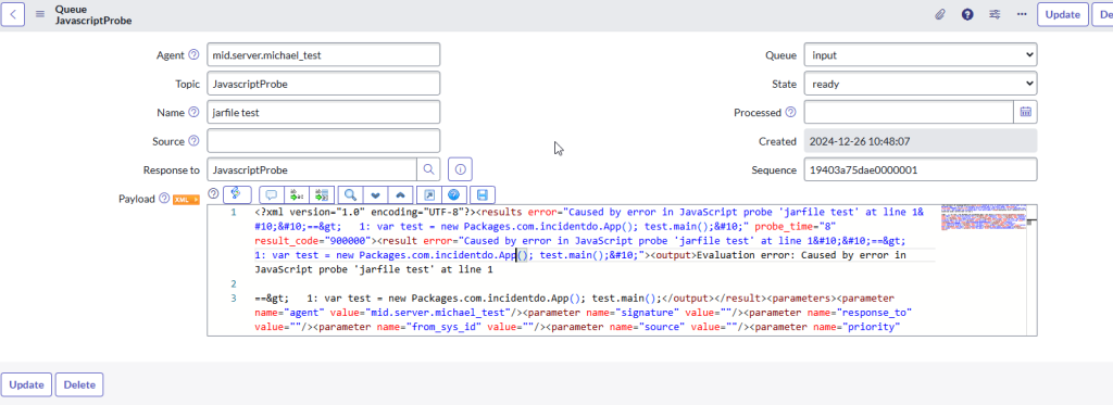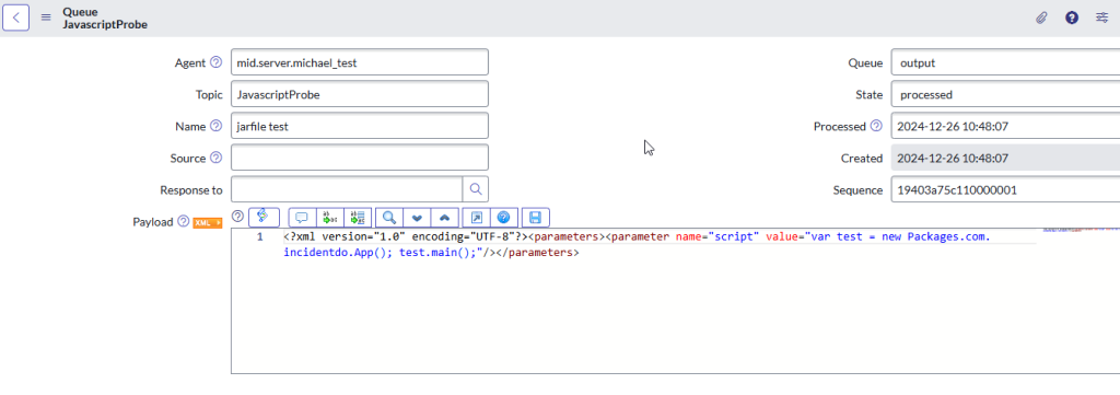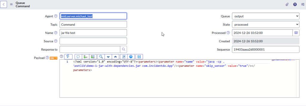 <?xml version="1.0" encoding="UTF-8"?><results probe_time="2368"><result command="java -cp .\extlib\demo-1-jar-with-dependencies.jar com.incidentdo.App"><stdout>Hello World!</stdout><stderr/></result><parameters><parameter name="agent" value="mid.server.michael_test"/><parameter name="signature" value=""/><parameter name="response_to" value=""/><parameter name="from_sys_id" value=""/><parameter name="source" value=""/><parameter name="priority" value="2"/><parameter name="agent_correlator" value=""/><parameter name="skip_sensor" value="true"/><parameter name="processed" value=""/><parameter name="error_string" value=""/><parameter name="sys_id" value="10d2b0941bbe5250ce0a6205604bcb21"/><parameter name="sequence" value="19403aaea2d0000001"/><parameter name="from_host" value=""/><parameter name="sys_created_on" value="2024-12-26 15:52:00"/><parameter name="sys_domain" value="global"/><parameter name="name" value="java -cp .\extlib\demo-1-jar-with-dependencies.jar com.incidentdo.App"/><parameter name="topic" value="Command"/><parameter name="state" value="ready"/><parameter name="queue" value="output"/><parameter name="ecc_queue" value="10d2b0941bbe5250ce0a6205604bcb21"/></parameters></results>