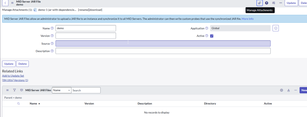 21. On the instance, go to the JAR files module and add a new record. The name doesn’t matter. Upload the jar file into the record. The file will sync to the extlib folder of the MID server. Note that it can take a minute or two to sync.